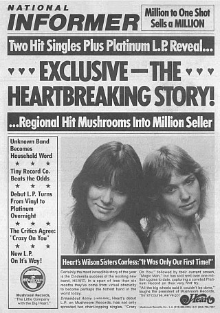 Long before t.A.T.u., Heart's record company used implied lesbianism to get attention. Ads like these are placed in trade magazines to stir interest in bands, and this one certainly stood out, but not in a good way for the sisters, who left Mushroom Records soon after it came out.